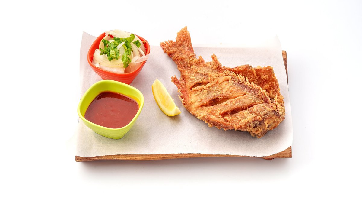сазан - 0,5 кг, форель жареная - 380 г, картофель фри, соус, лук
