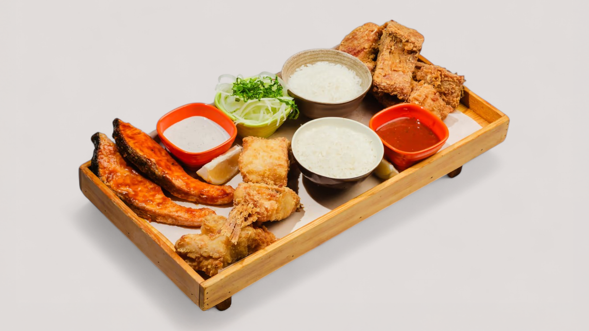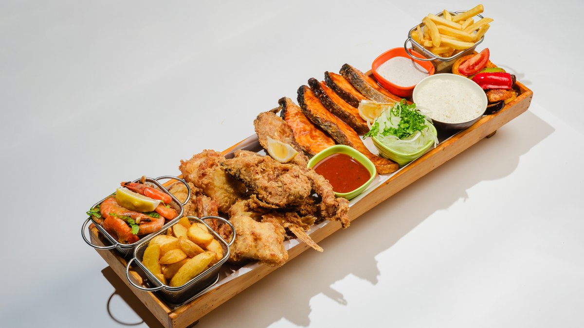 сёмга — 750 г, сазан — 500 г, судак — 500 г, креветки — 250 г, овощи на гриле — 250 г, картофель фри — 250 г, картофель по-деревенски — 350 г, рис — 1 порция, лук, соус белый и красный
