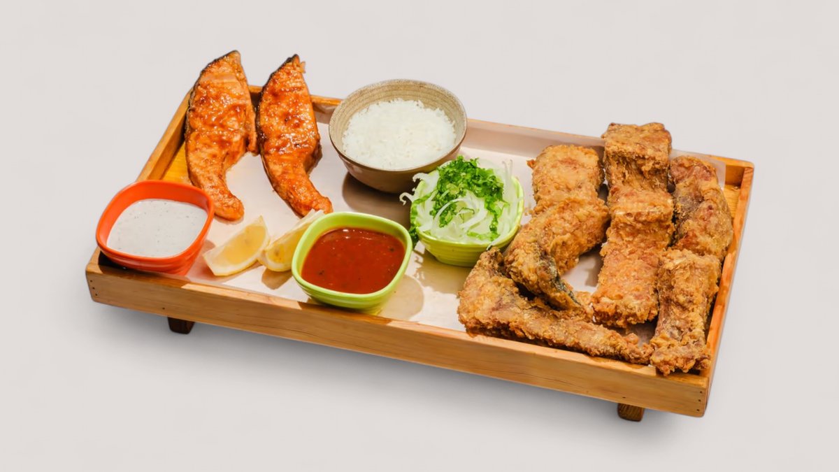 сазан — 1 кг, семга — 2 полустейка (300–350 г), рис — 1 порция, лук, соусы: белый и красный ВЕС РЫБЫ В СЫРОМ ВИДЕ