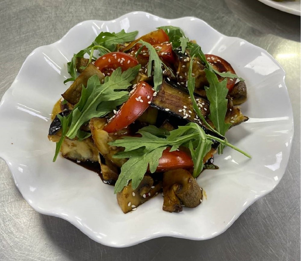 Обжаренные баклажаны, помидоры "Чери", шампиньоны, кунжут, соус "Свит Чили", руккола