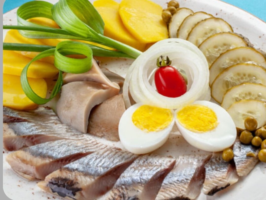 филе сельди, отварной картофель, соленый огурец, квашеная капуста