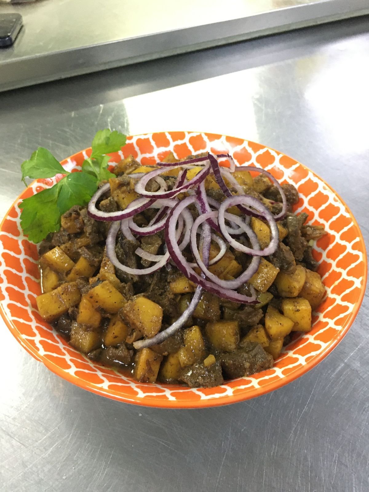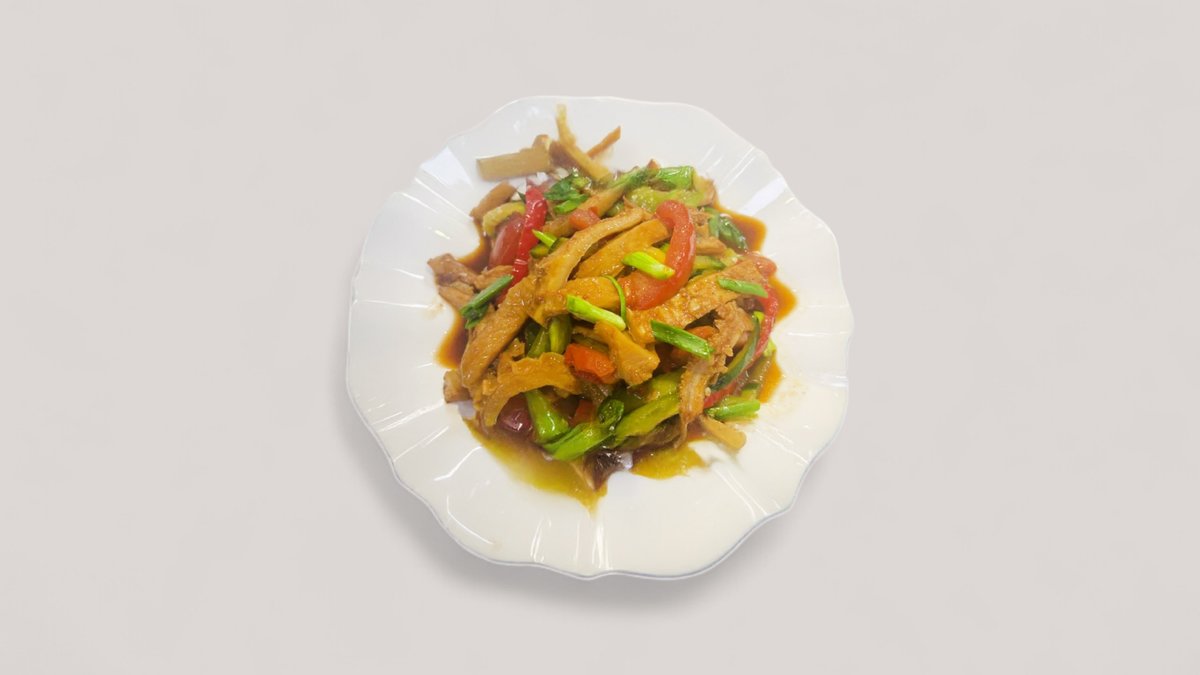 Обжареная говяжья требуха, острый перец, зелень, специи, соус "Тайфун"