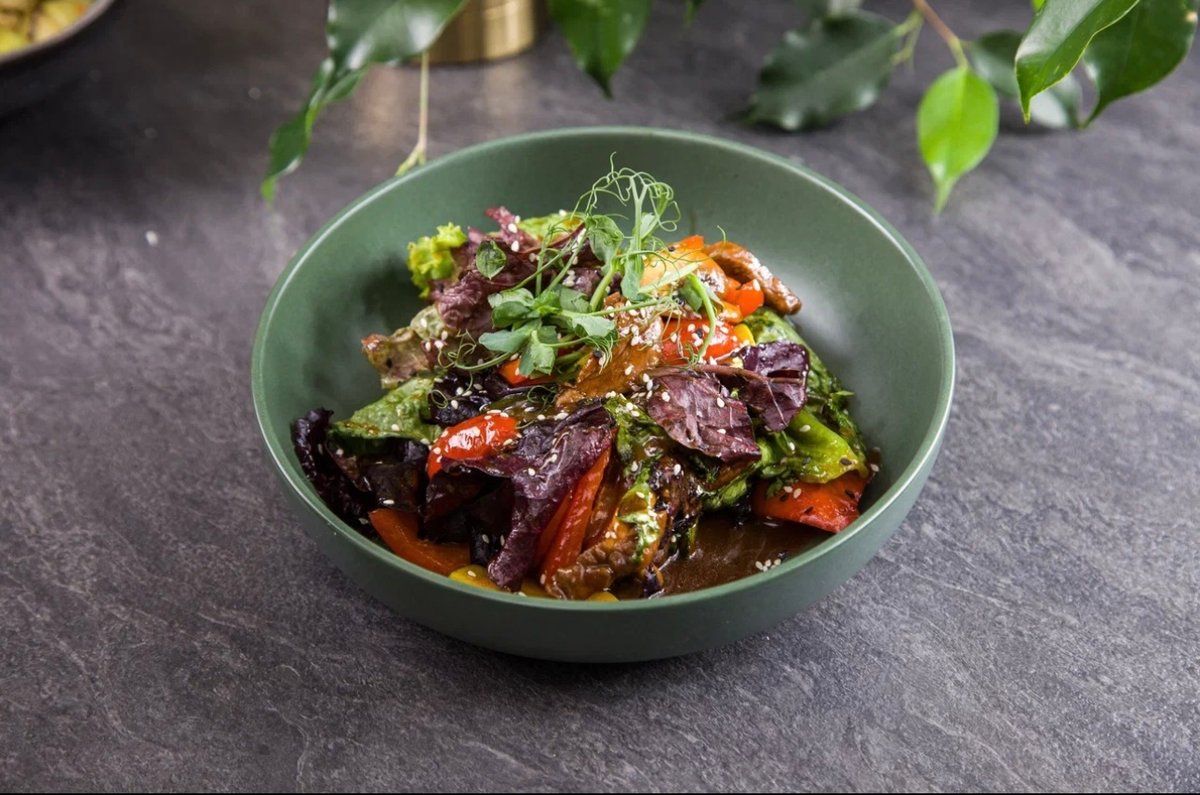 Теплый салат с курицей в соусе терияки
