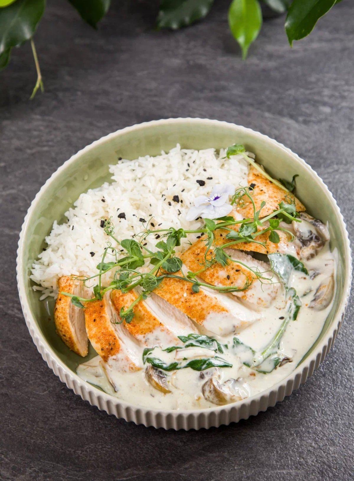 Куринный стейк в сливочно грибном соусе со шпинатом и рисом