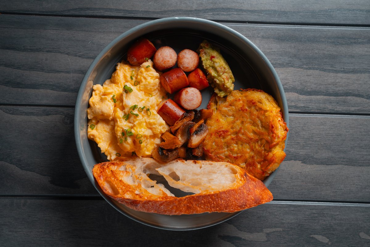 Скрембл,колбаски куринные, картофельный драник, Гуакамоле,шампиньоны,Чиабатта
