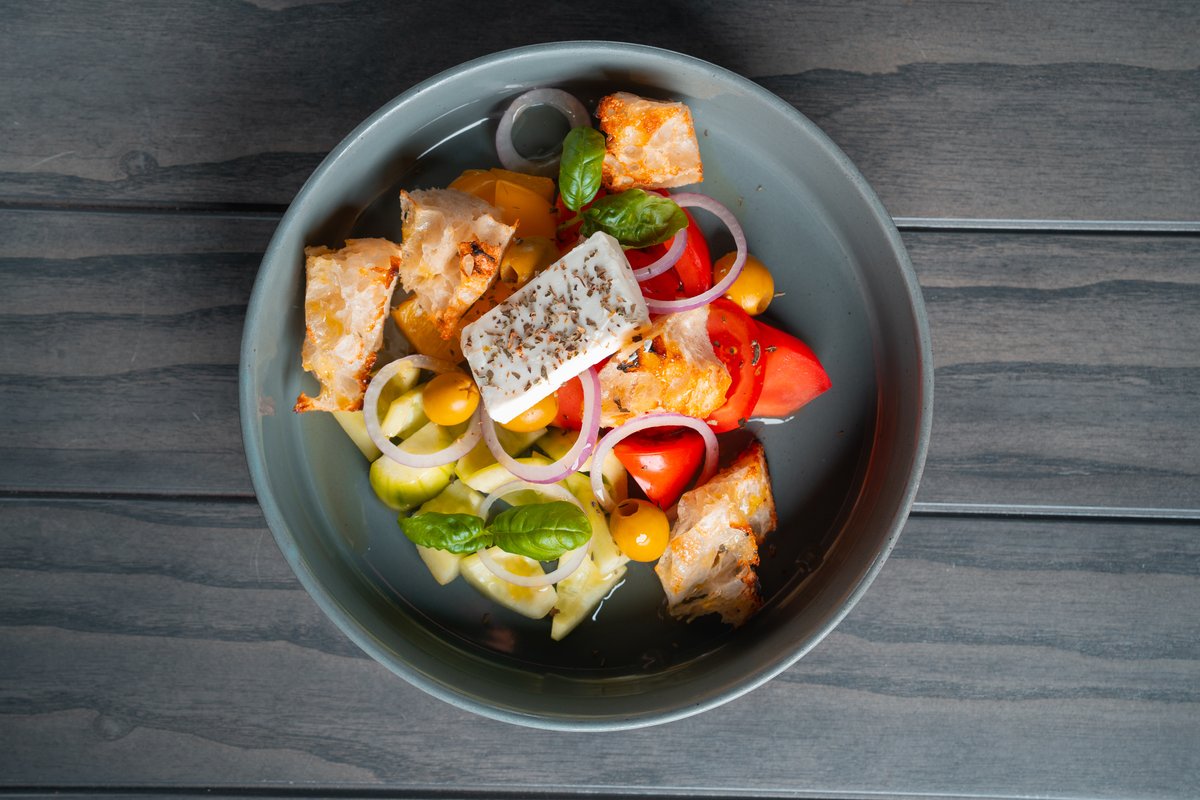 помидоры черри,свежий огурец,болгарский перец,крутоны,оливки,сыр салакис,лук красный,прованские травы