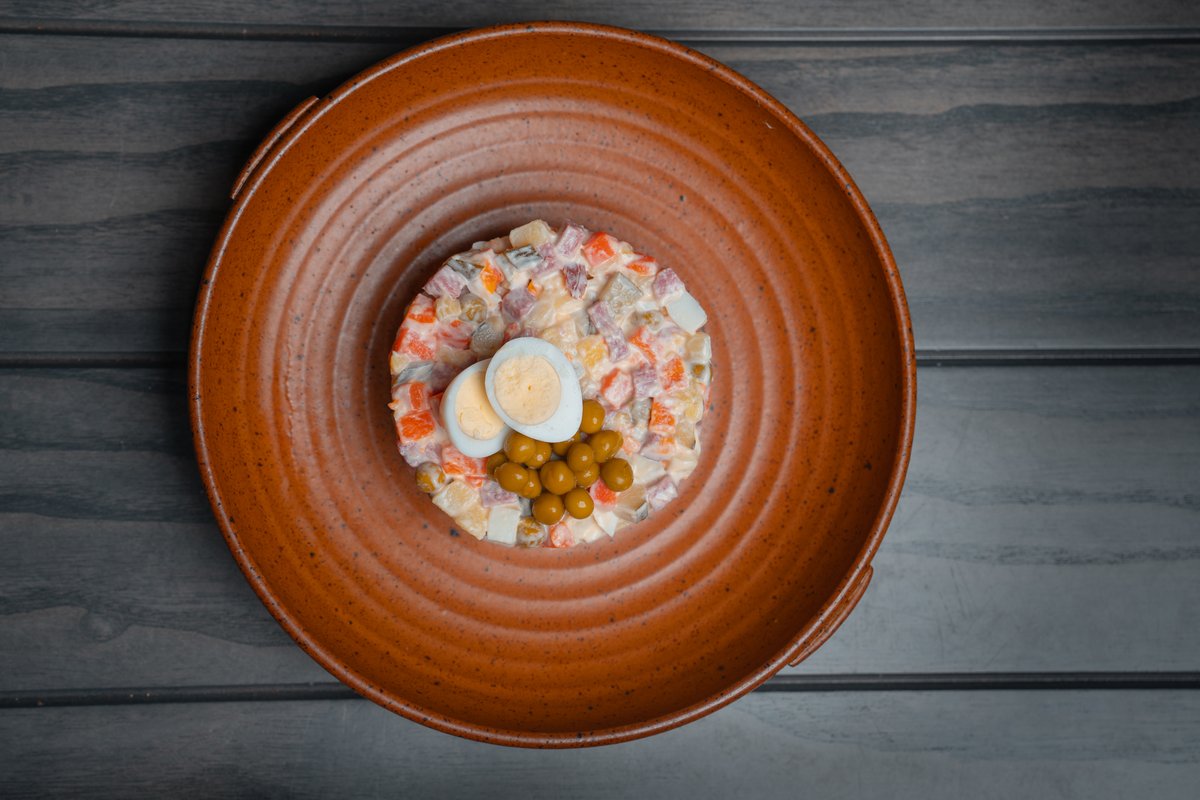 копчённая говядина,картофель,морковь,солёный огурец, яйцо кур,майонез,перепелиное яйцо,горошек