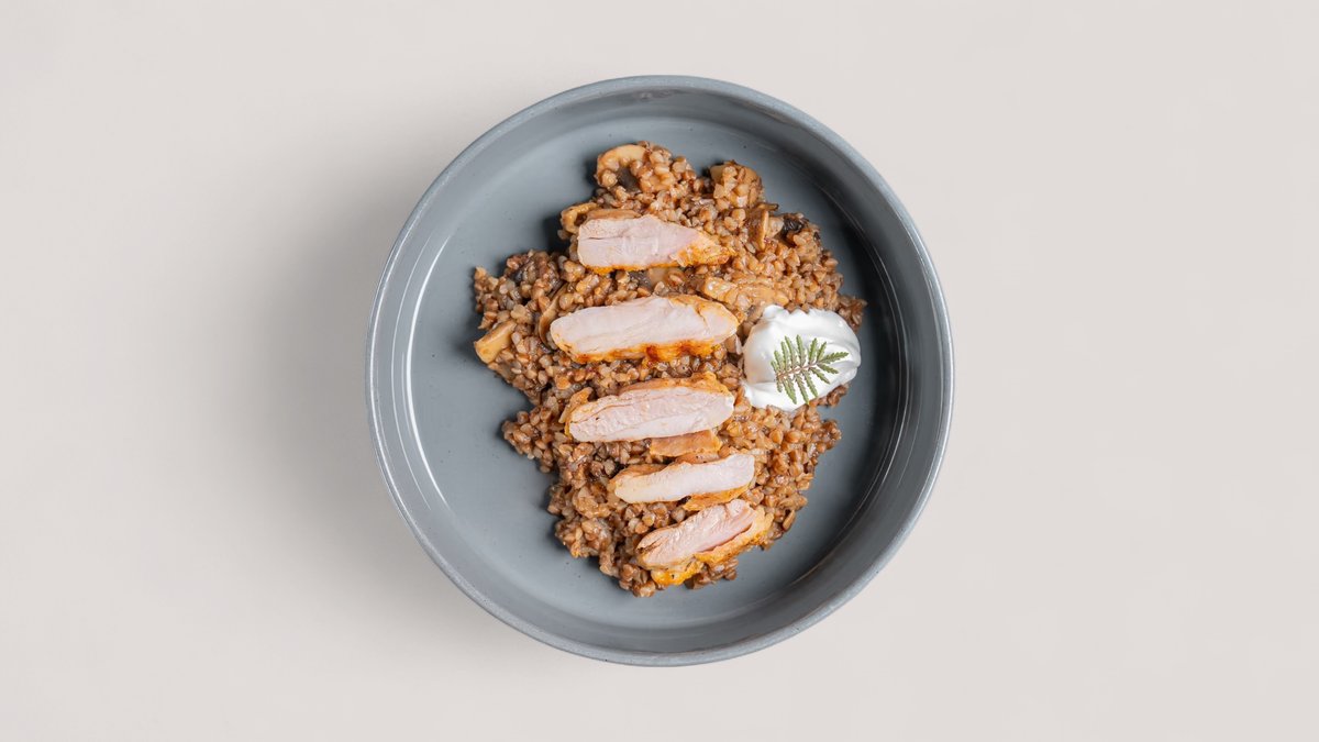 Гречка, шампиньоны, соус дэмиглас,куриное бедро, сметана