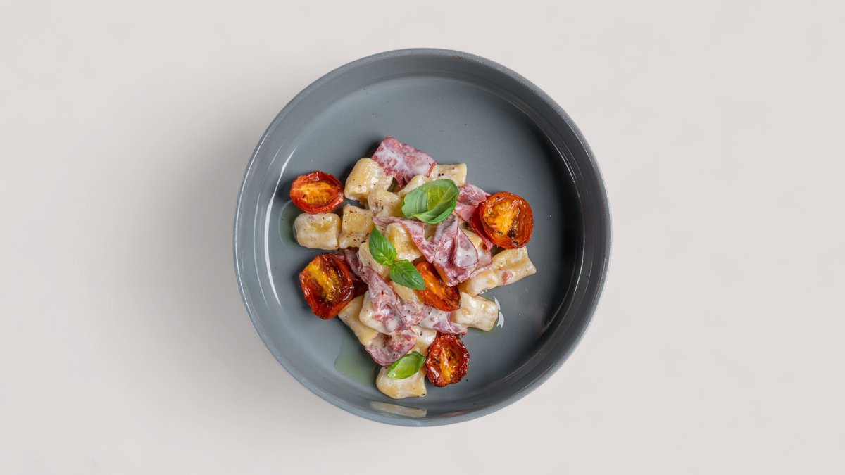 паста ньокки,копченная говядина, сливочный соус,помидоры черри конфи