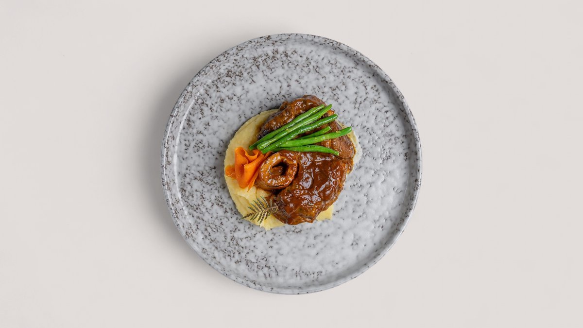 говядина,лук репчатый,морковь,сельдерей,апельсин,соевый соус,соус дэмиглас,картофельное пюре,фасоль стручковая