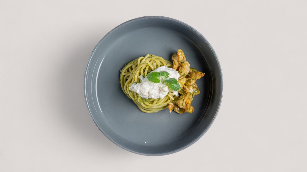Спагетти песто с креветкой и страчателлой