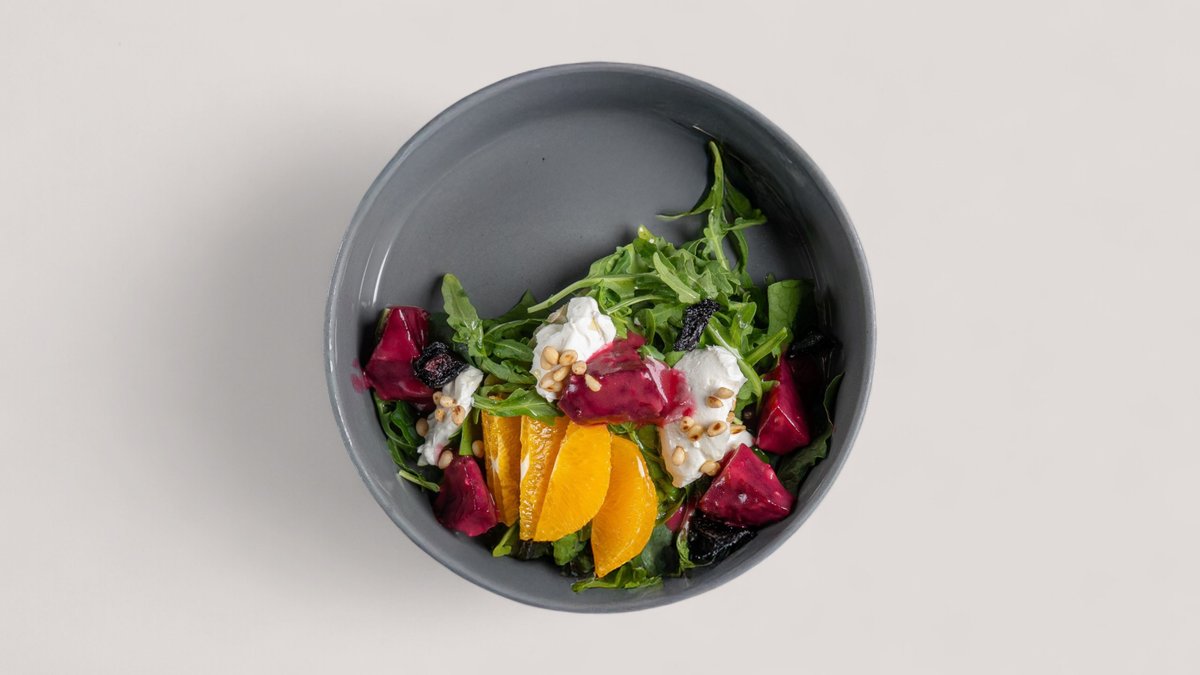 Салат руккола,шпинат,оливковое масло,печеная свекла,творожный мусс,мякоть апельсина,кедровые орешки