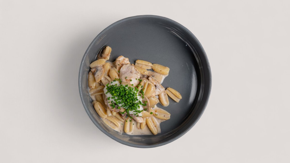 паста ньокки,кур филе,шампиньоны,трюфельная паста,сливочный соус,сыр страчателла,лук шнит