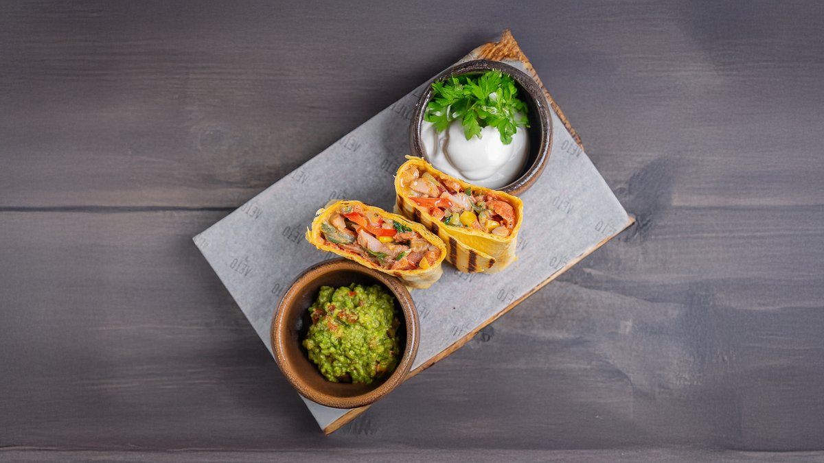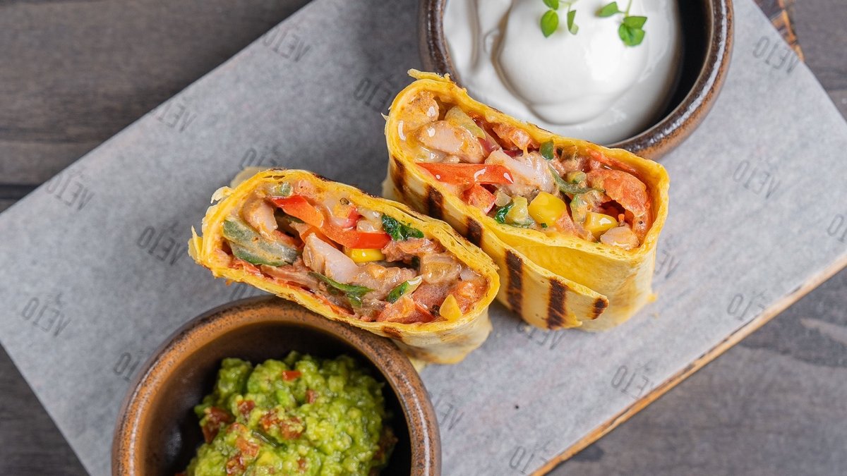 Сырная лепёшка тортилья,свежий огурец, кукуруза, красный лук,помидор, болгарский перец,сметана, острый соус, гуакамоле, кур бедро