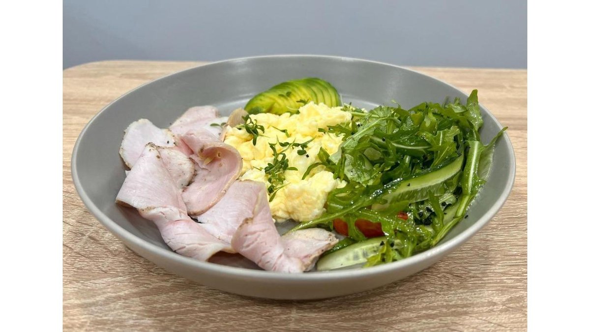 Скрэмбл на сливках, семга, авокадо, зелень