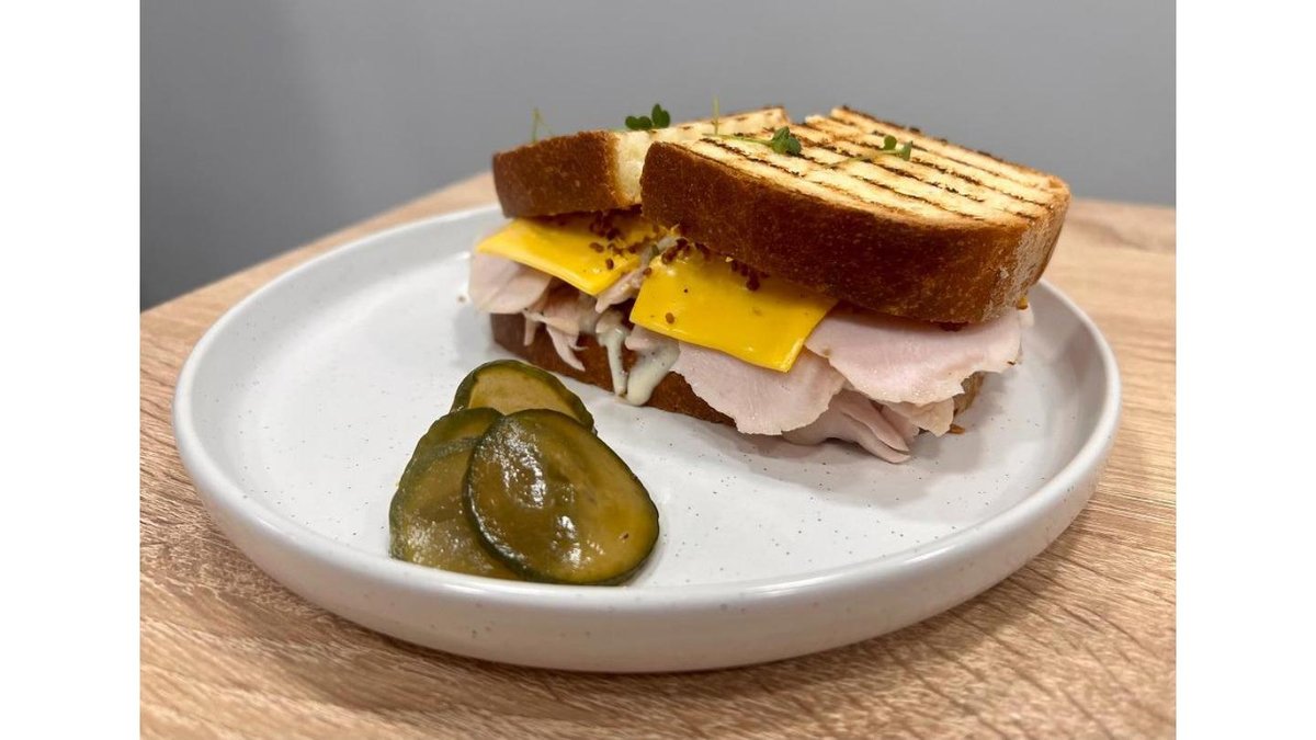 Тостовый хлеб собственного приготовления, индейка, сыр чеддер, домашний майонез, сладкая горчица, маринованные огурцы
