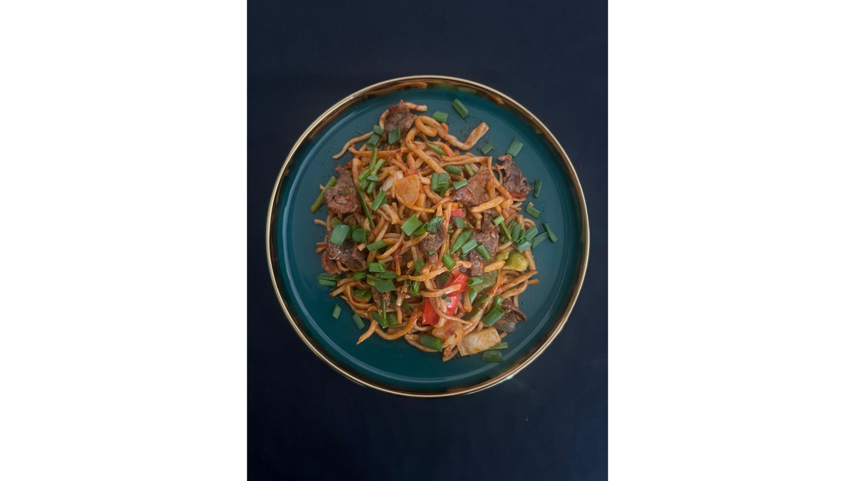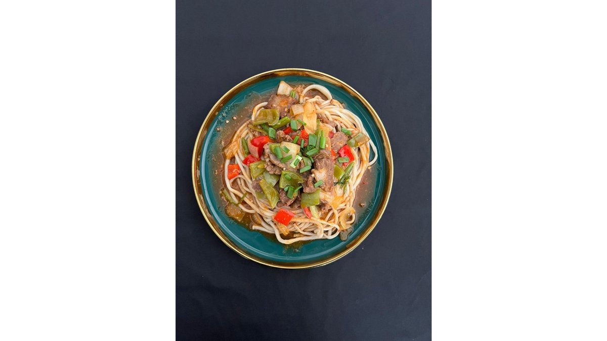 Уйгурское блюдо с жареной нежной говядиной, домашним тестом и овощами