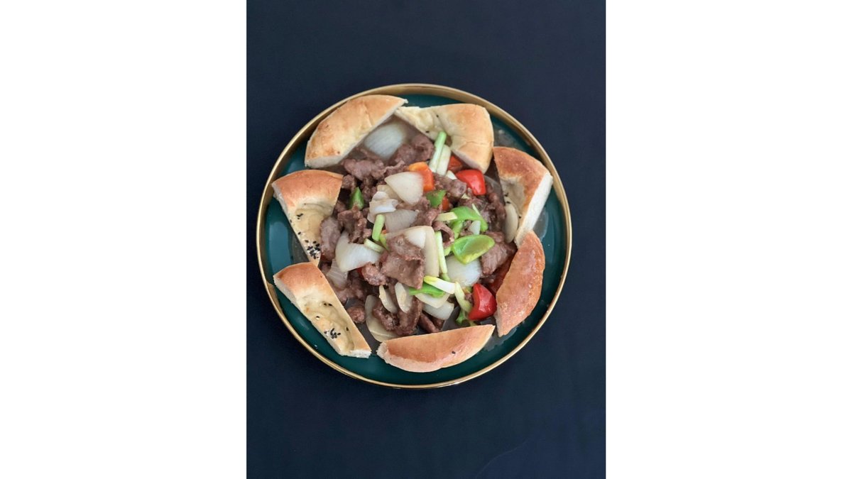Уйгурское блюдо с нежной говядиной и овощами, лепёшка