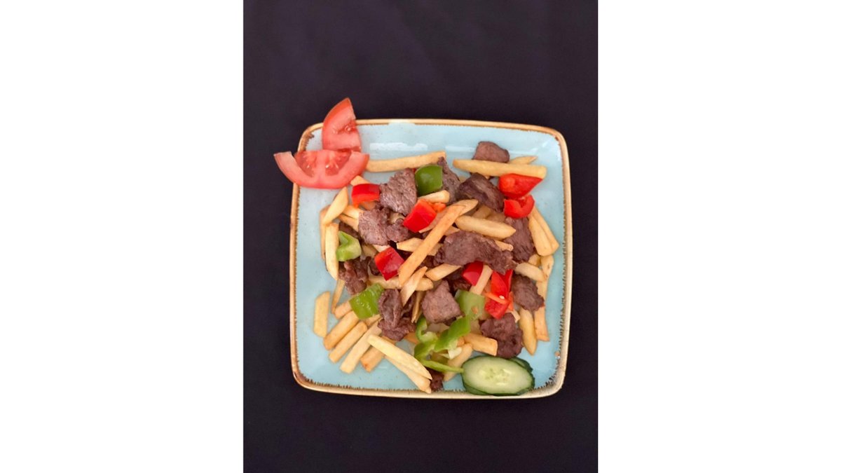 Уйгурское блюдо с нежной говядиной, картошкой фри и овощами