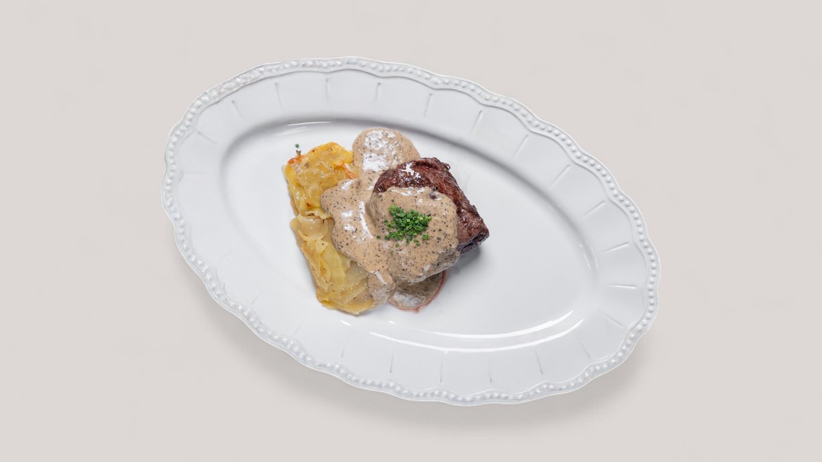 говядина ,пепер соус,гратен картофельный,шнит лук,соль,перец,ростительное масло,ароматное масло