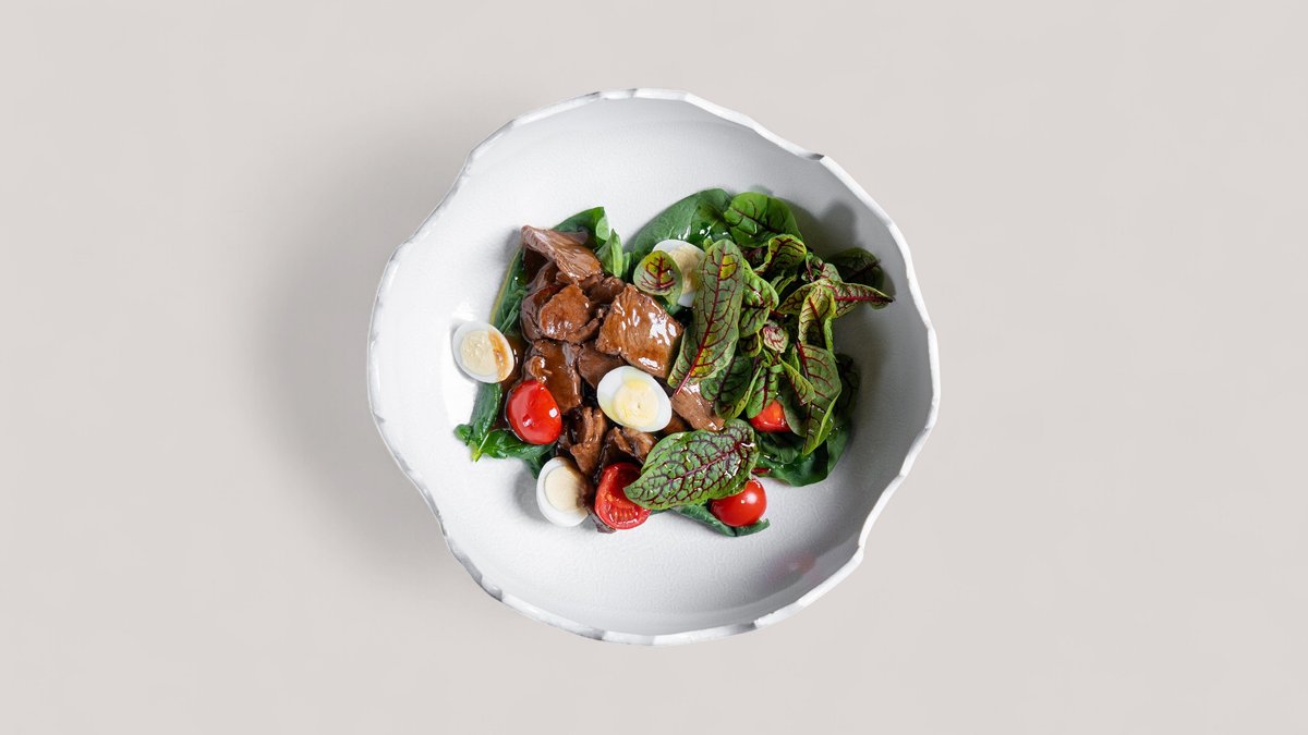 шпинат, говядина , соус имбирый, черри, перепелиное яйцо