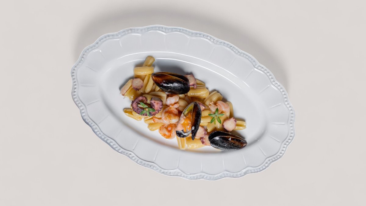 паста,осьминог,креветки,миди,чеснок,перец,чили,вино белое,бульен куриный,слив масло,олив масло,микрозелень