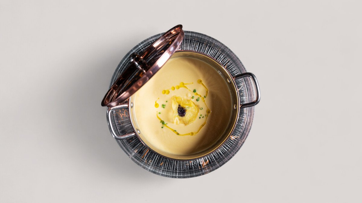 осьминог сувид на гриле, пюре картофельное со страчателлой, острое масло