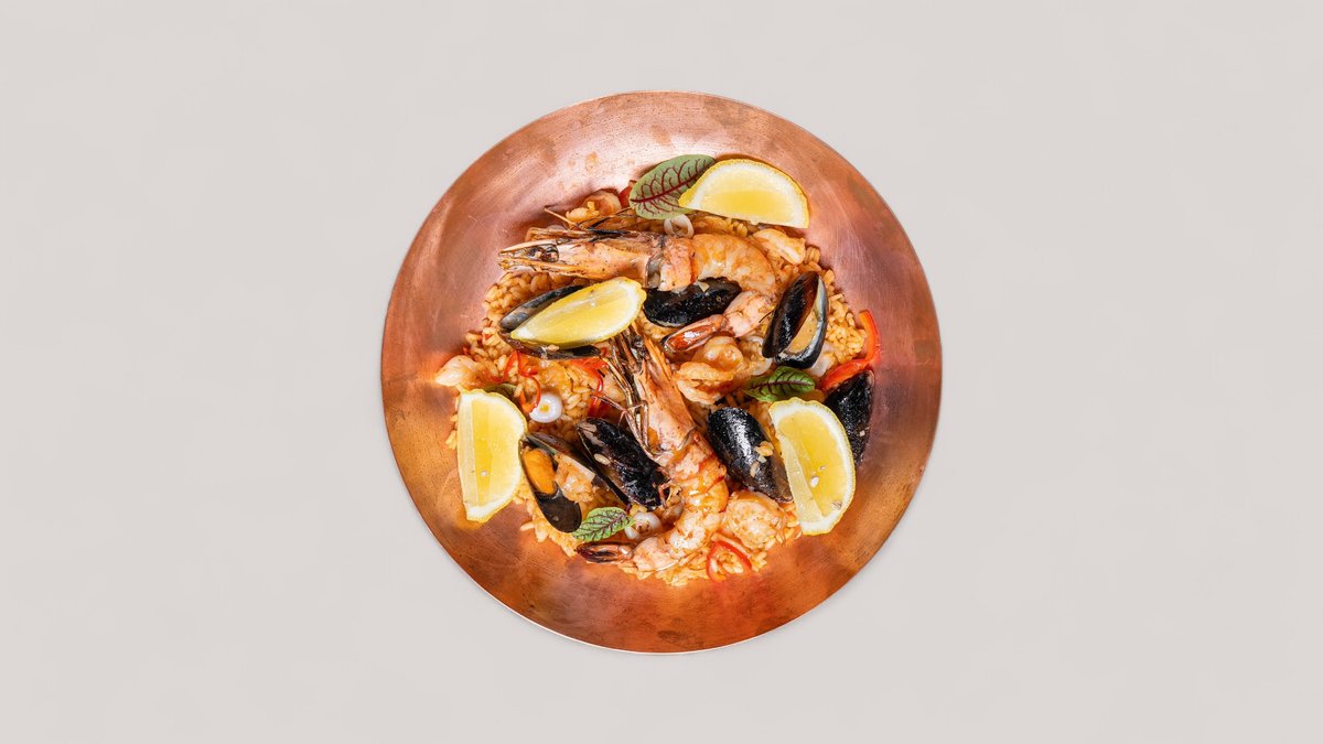 рис карнаролли , лук,чеснок, чили, болгарски перец, вино белое, соус гарлик, мидии ,креветки, креветка с головой, паприка, командорски кальмар.