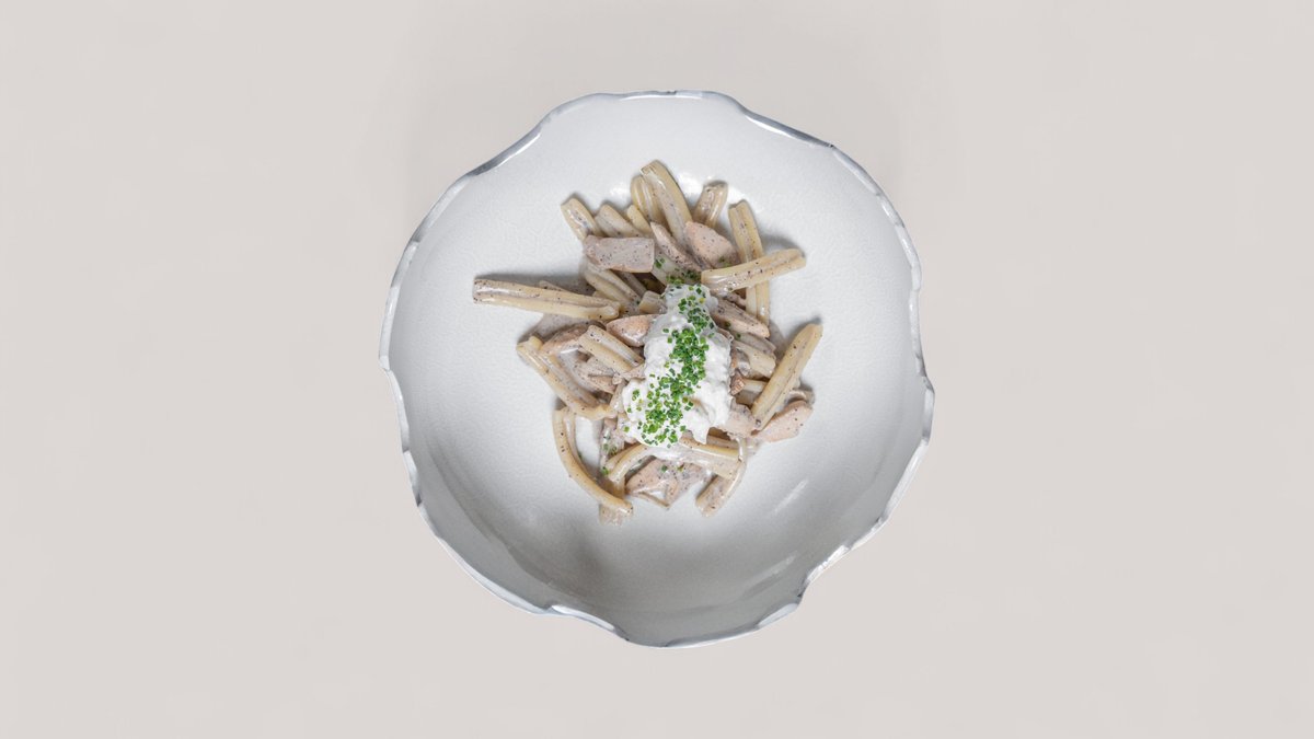 куриное бедро, лук шалот, сливки, сыр страчателла, паста, чеснок, масло оливковое, вино, белые грибы