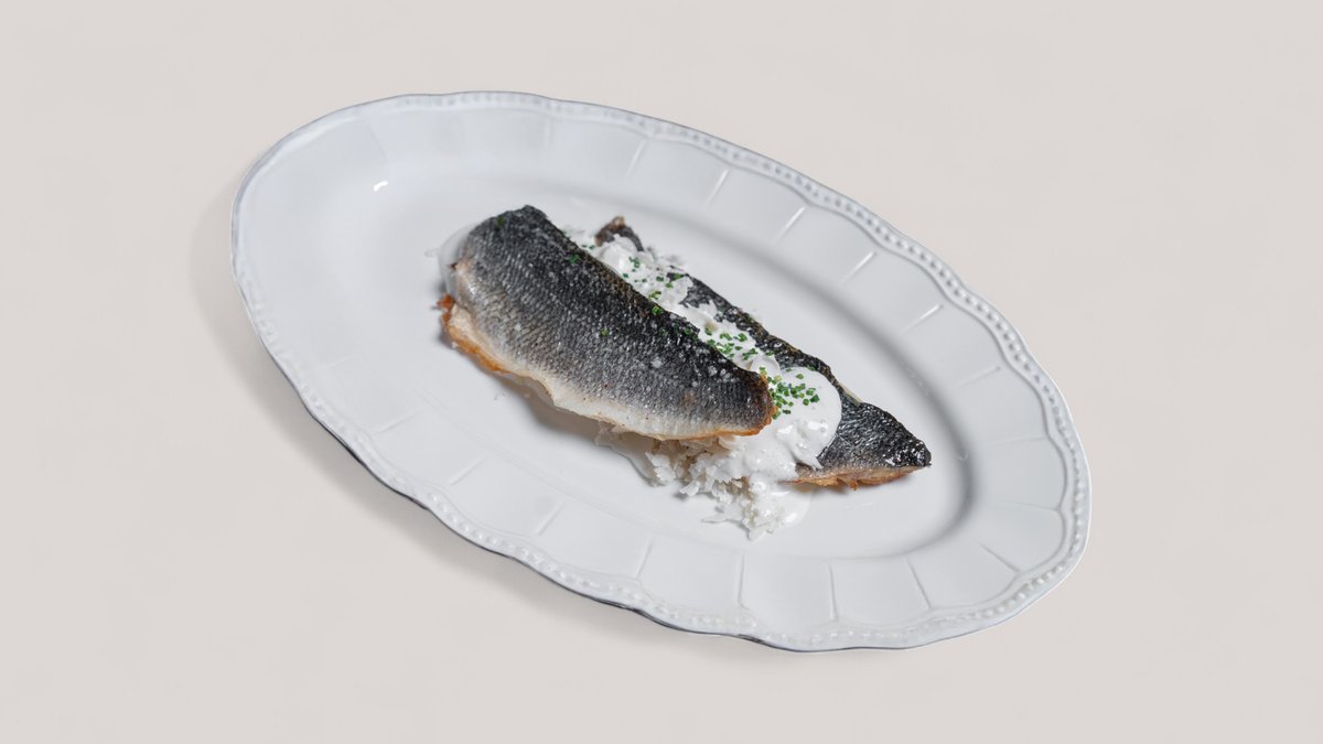 сибас,сырный мус,цветная капуста,шнит лук,тимьян ,чеснок,олив масло,соль,перец.