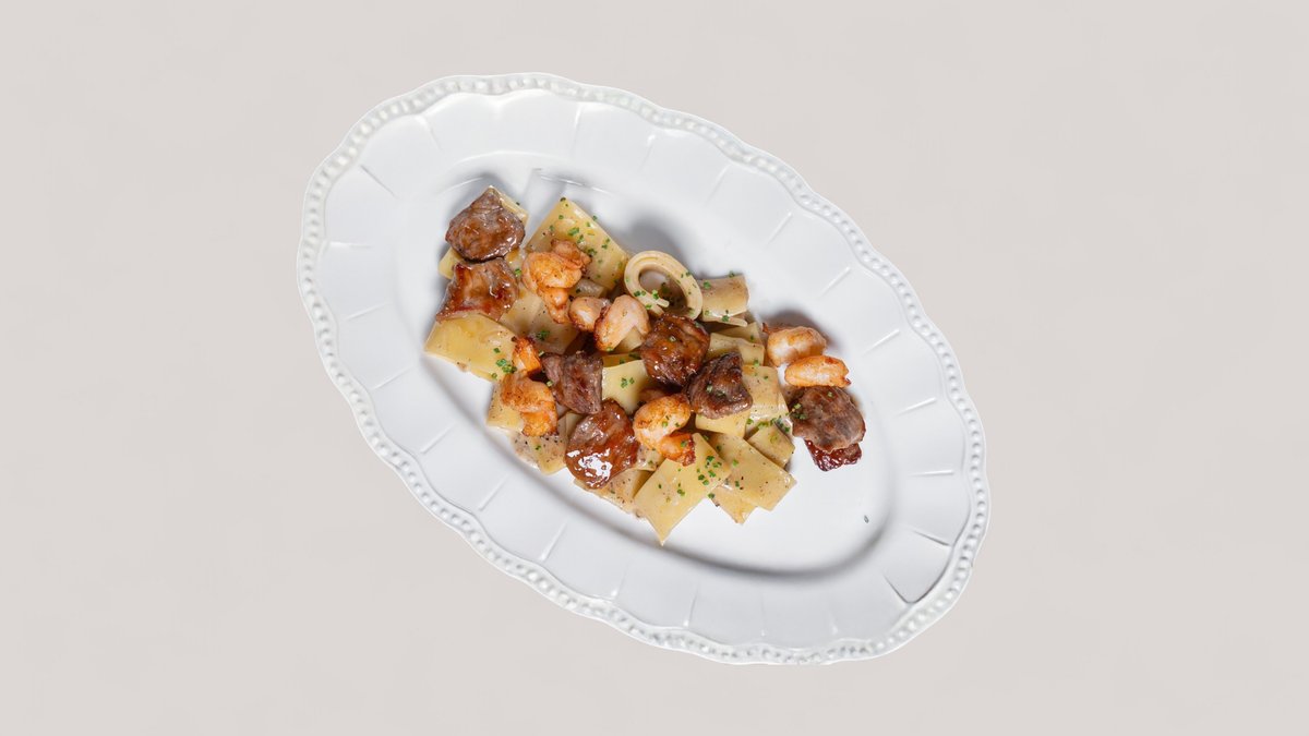 паста паккери,пармезан,черный перец,рибай мраморный,креветки,масло ростительное ,теряки соус,шнит лук