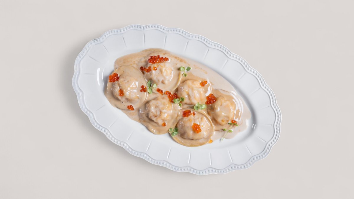 равиоли с лососем, сливочный-демиглас соус, икра красная, микрозелень