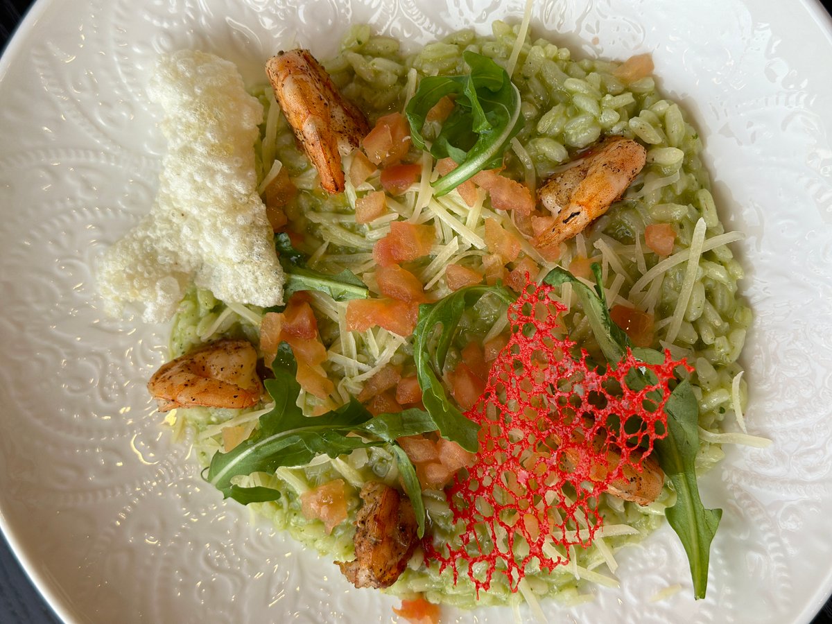 рис арборио, обжаренные креветки, специи, соус песто