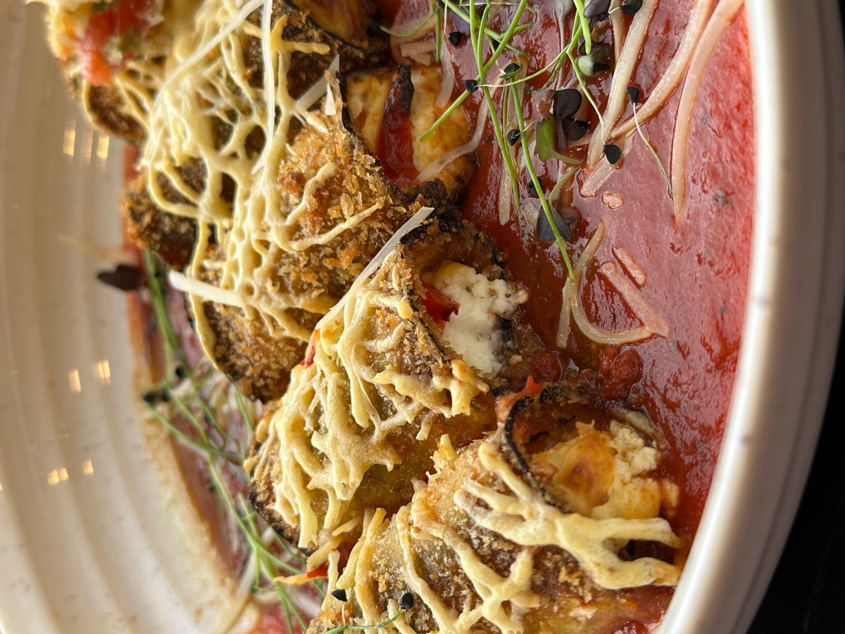 Слайсы из баклажан в панировке, творожный сыр, соус песто