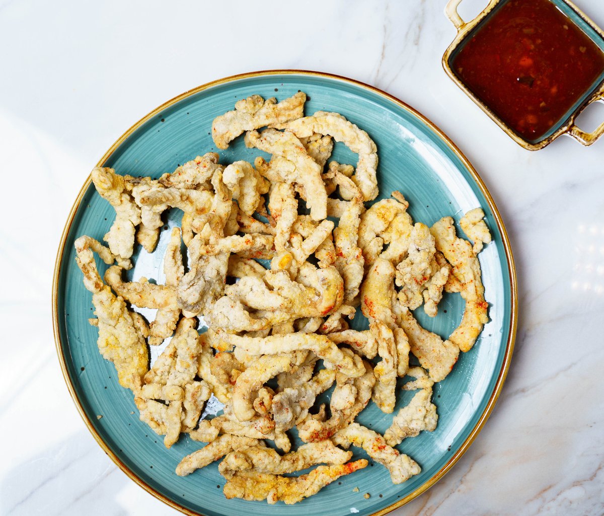 Картофель фри, филе куриное, перец полугорький, кинза, специй.
