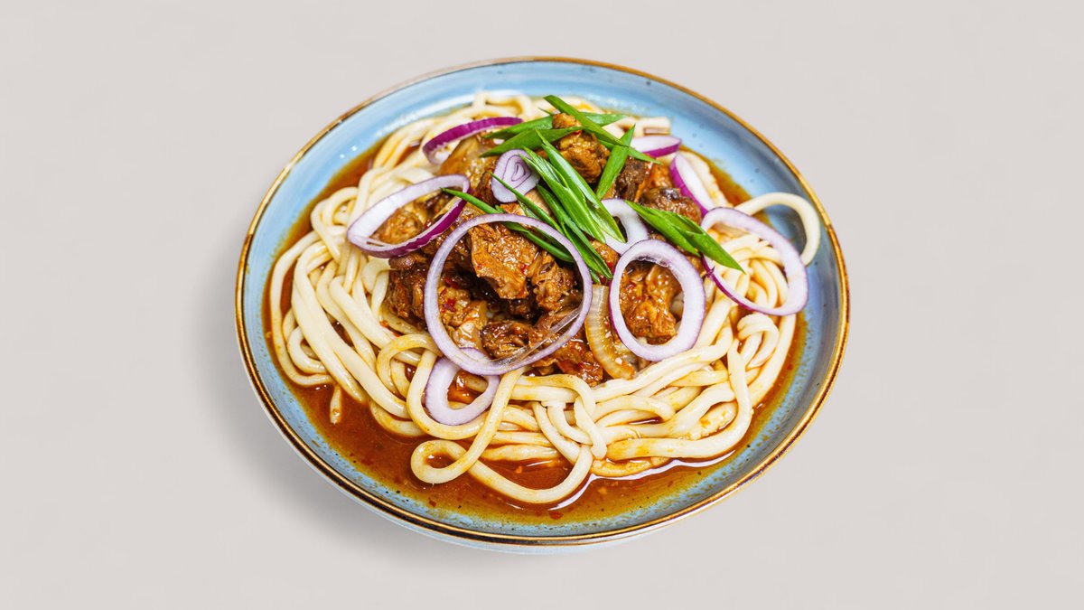 Обжаренная на вок-сковороде говядина, лук репчатый, соус для лагмана, тесто