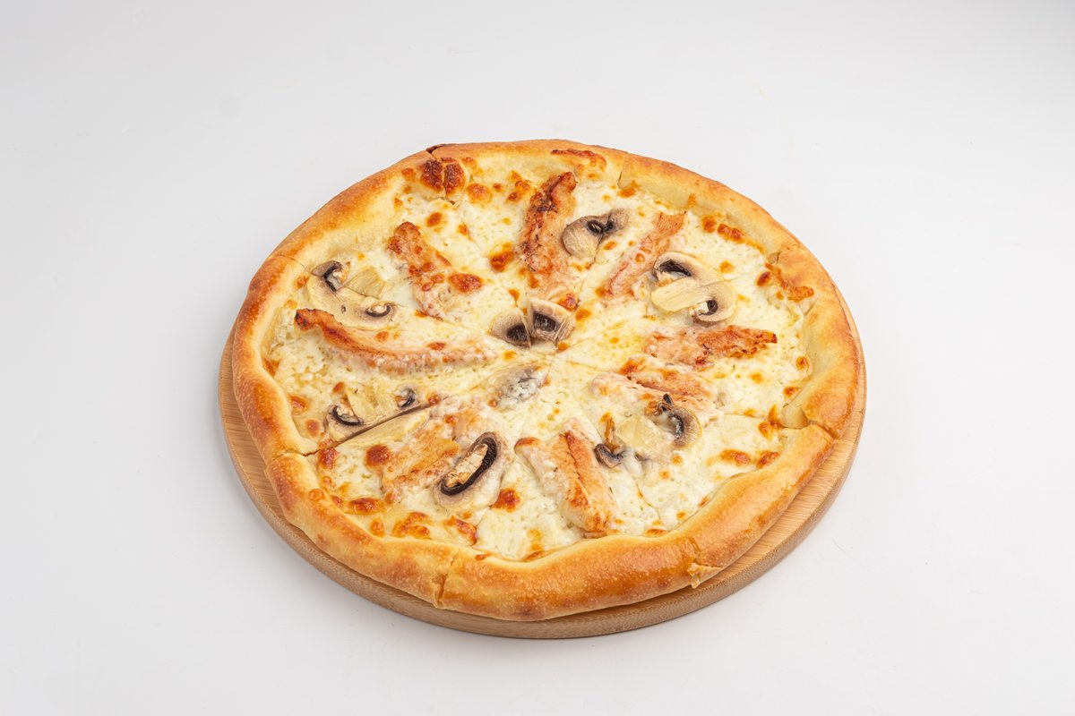 тесто, сливки, сыр моцарелла, куриное филе, грибы