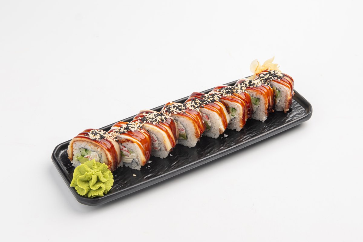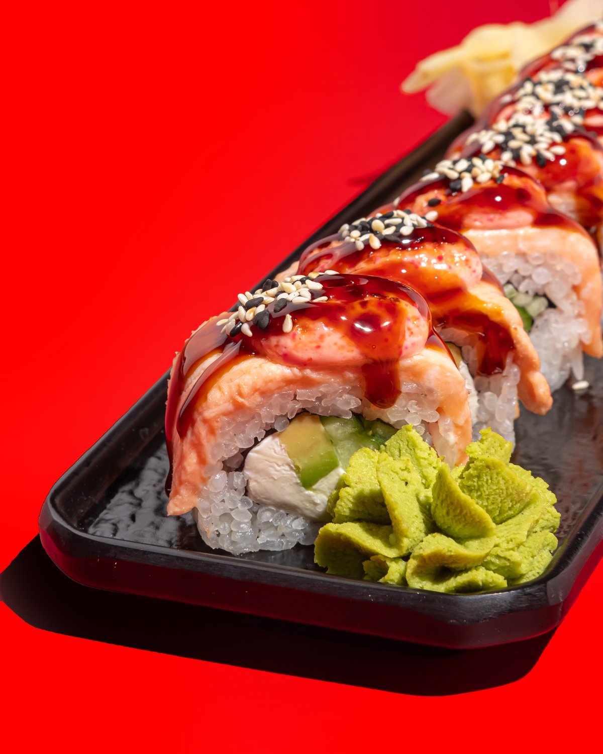 рис, нори, креметта, авокадо, огурцы, лосось, спайси соус, унаги соус, кунжут