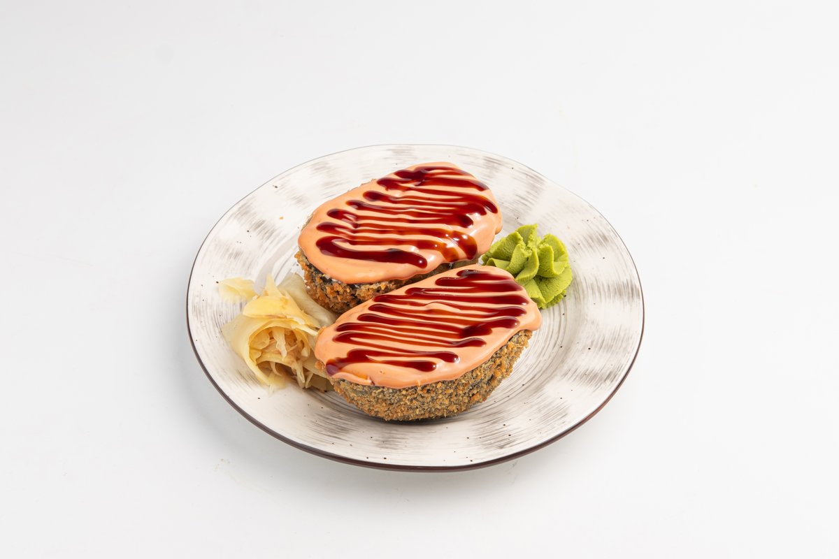 рис, нори, креметта, тобико, лосось, огурцы, ломтик сыра, кляр, сухари, бургер соус, унаги соус
