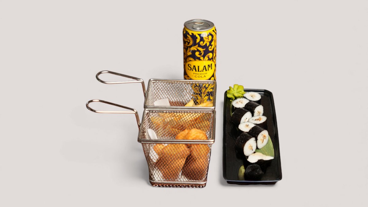 пицца маргарита, наггетсы, фри, темпура, запеченный угорь, запеченный лосось, пепси 1 л