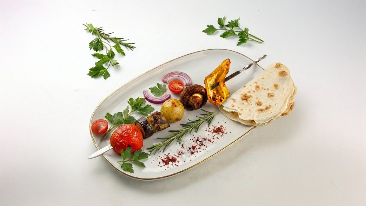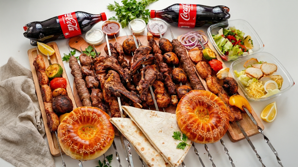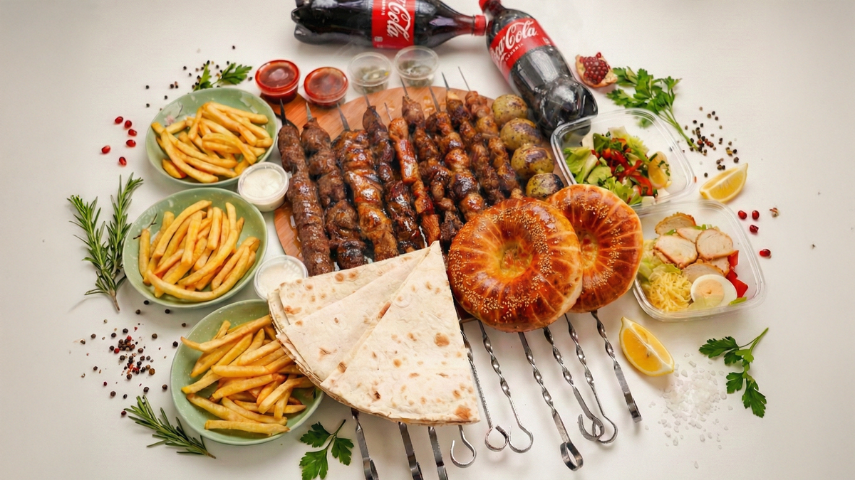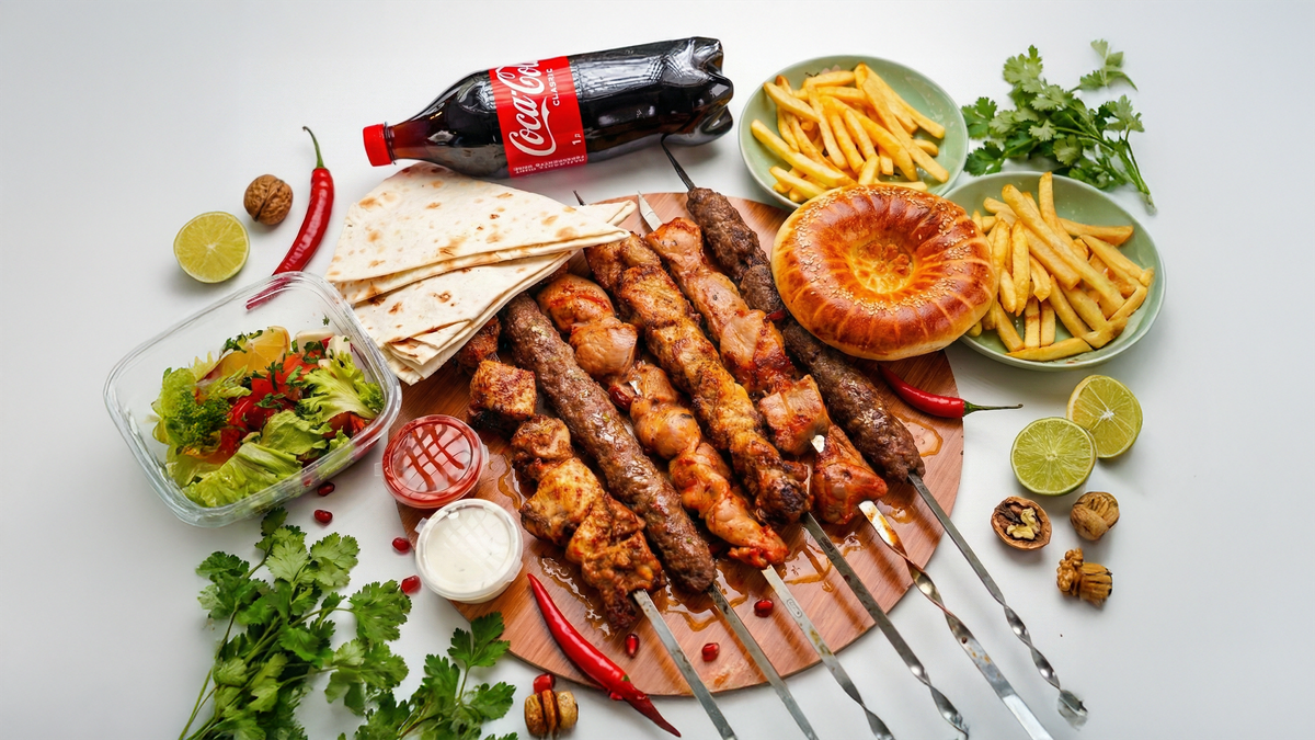 Баранина -1 порция Люля -кебаб -1 порция Шашлык из утки -1 порция Лепешка -1 шт Напиток - 1л Салат - 1 порция Картофель фри - 1 порция Соус - 2 шт