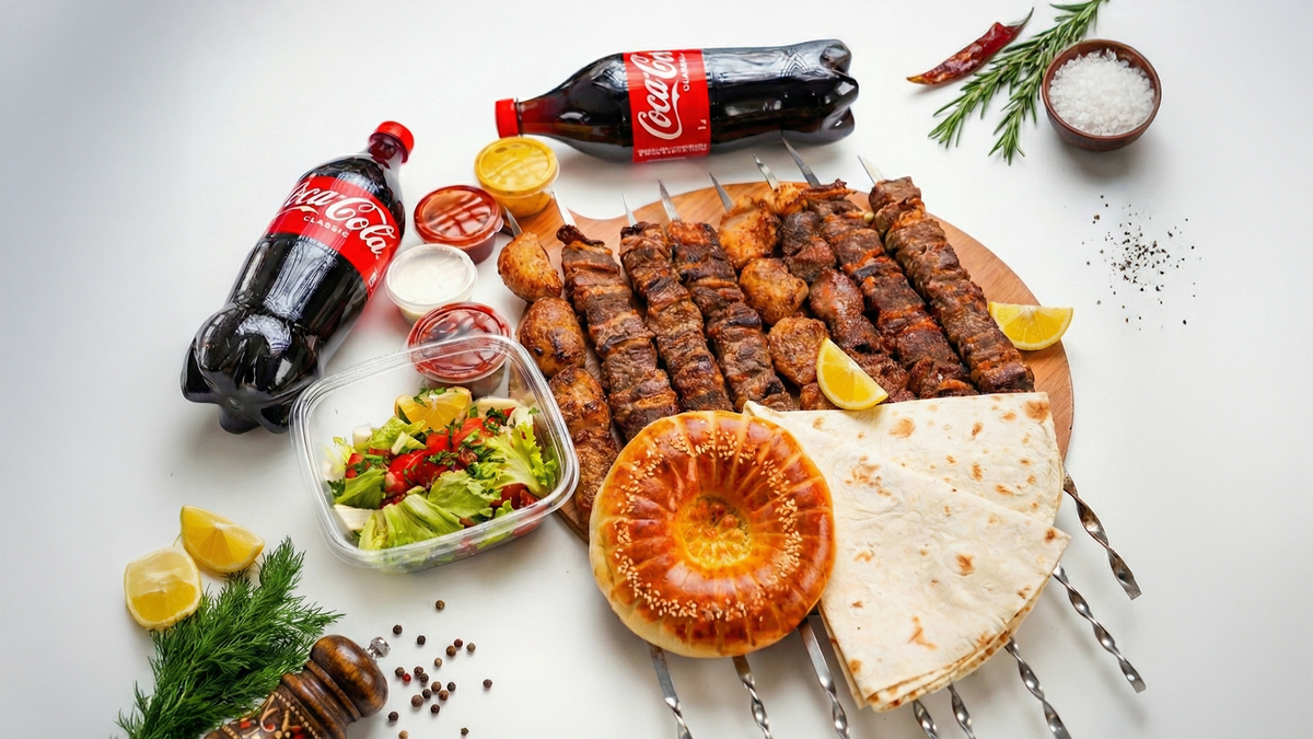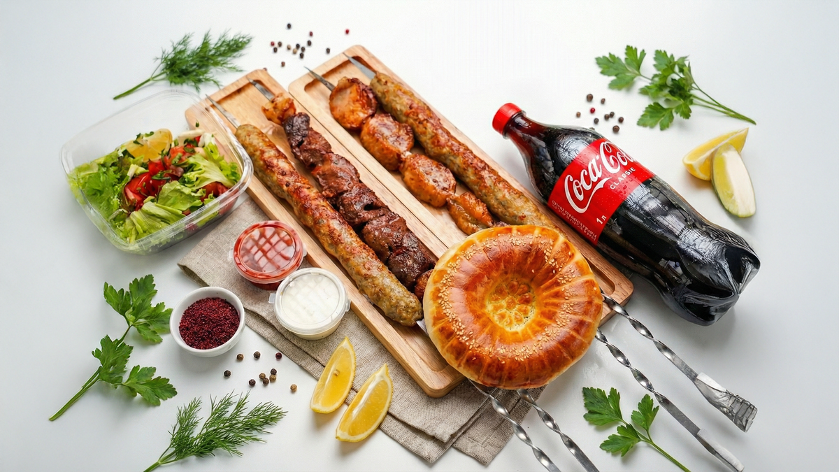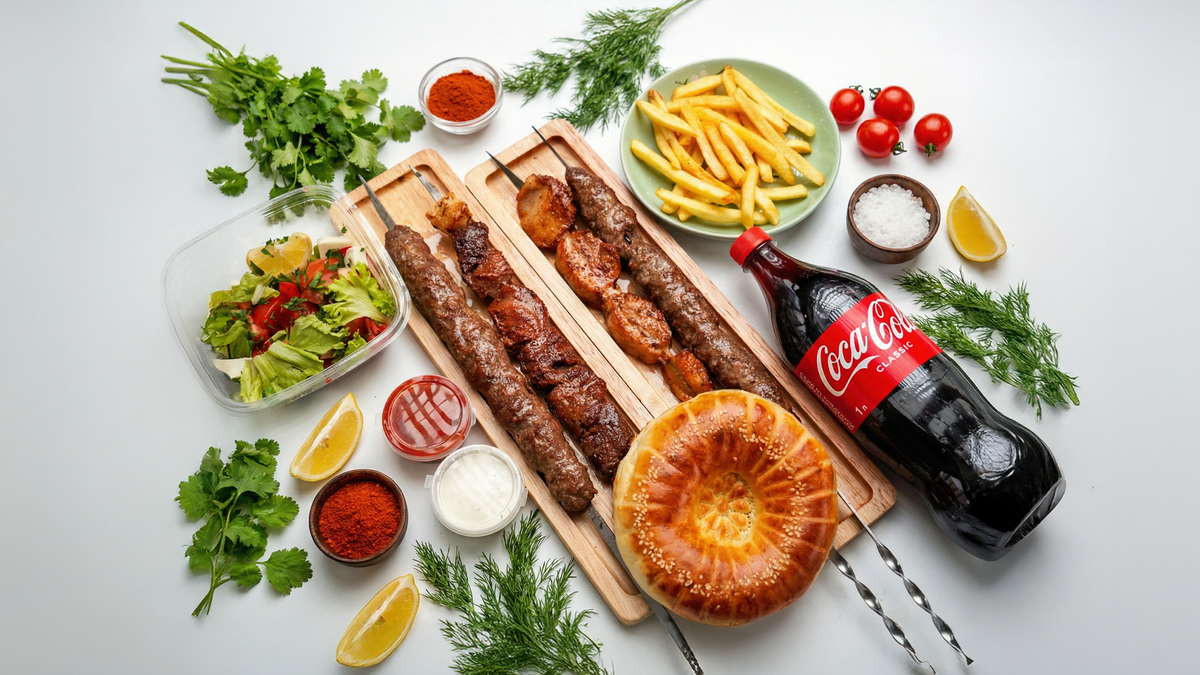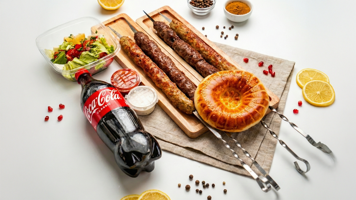 Люля-кебаб (3 шт.), салат (1 шт.), лаваш (2 шт.), соус (2 шт.), Coca-Cola (1 л, 1 шт.)