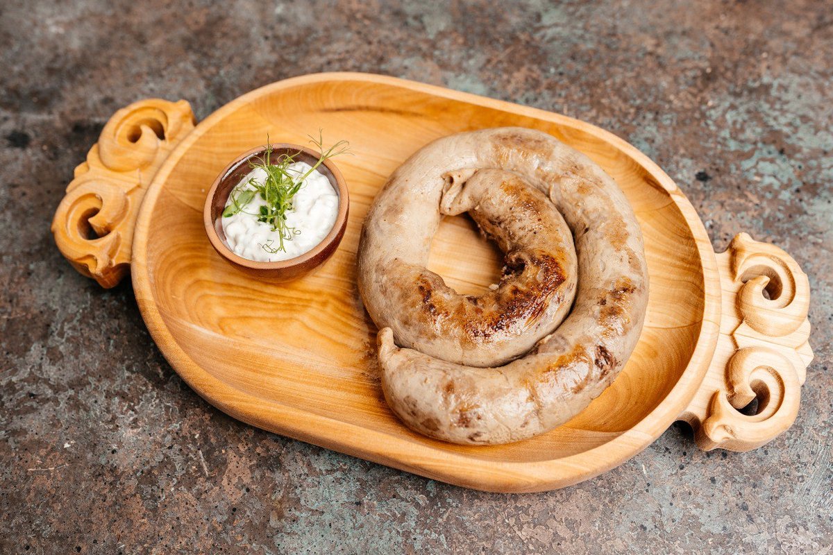 национальная колбаска, тар-тар из помидор и огурцов, микс салата, сметана