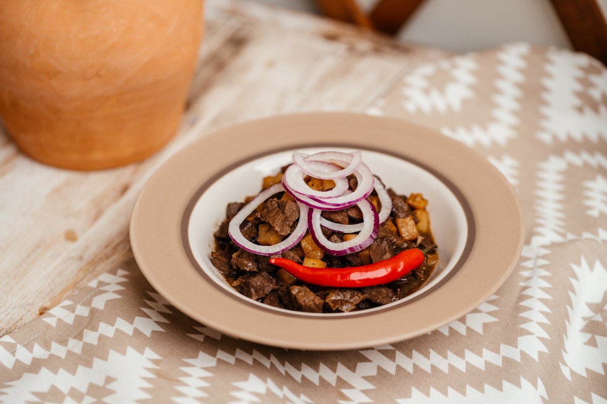 классика казахской кухни, где сочное мясо жеребца тушится с ароматным картофелем, пропитываясь специями и соком