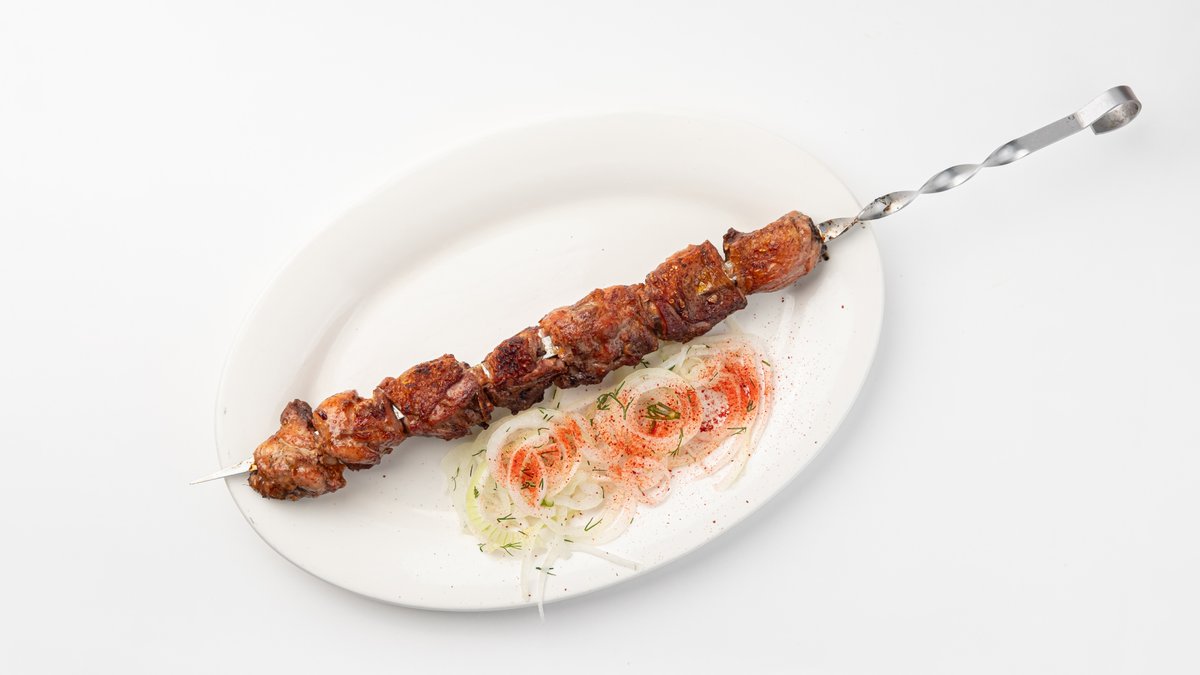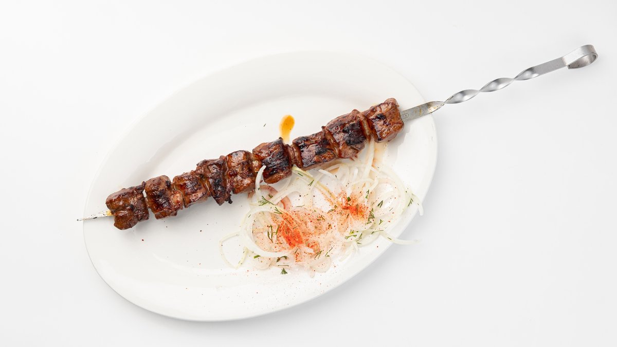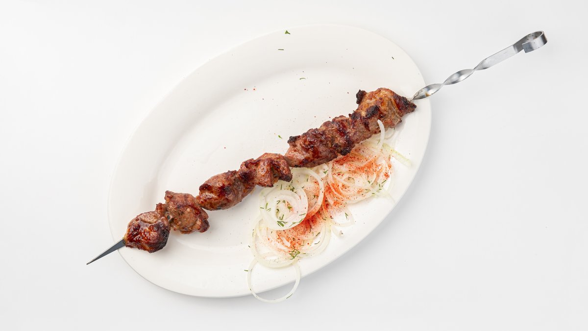 Нежнейшие кусочки баранины, обжаренные на углях до идеальной степени прожарки. Подчёркнуты солью, перцем и лёгким ароматом дыма