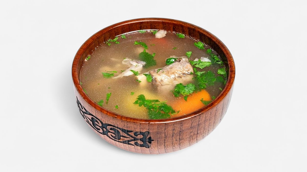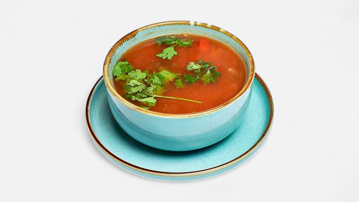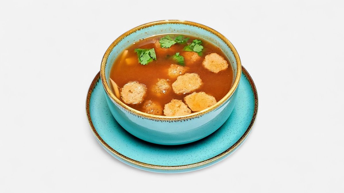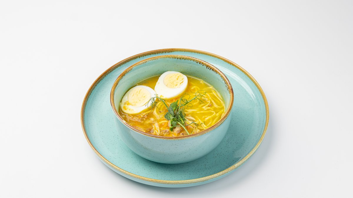 Прозрачный куриный бульон с нежной лапшой ручной работы, отборным куриным филе,зеленью. Подача — в глубокой тарелке с акцентом на чистоту вкуса и теплоту домашней классики в ресторанной интерпретации