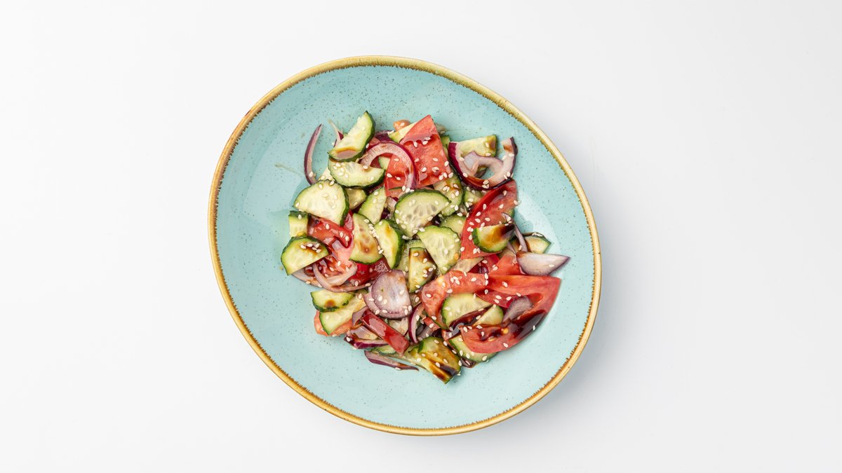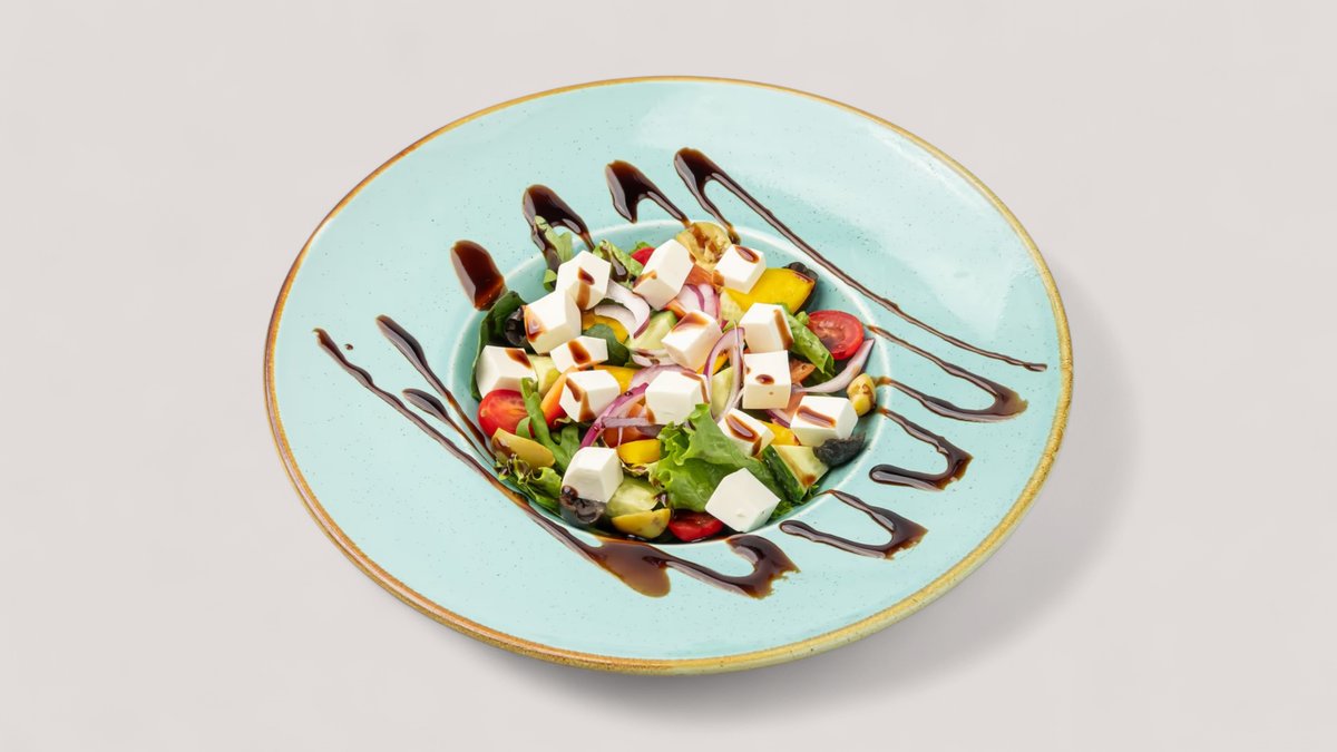 Классический средиземноморский салат из свежих томатов, огурцов, сладкого перца, красного лука и оливок, с крупными кусочками феты, приправленный оливковым маслом. Лёгкий, сочный и освежающий