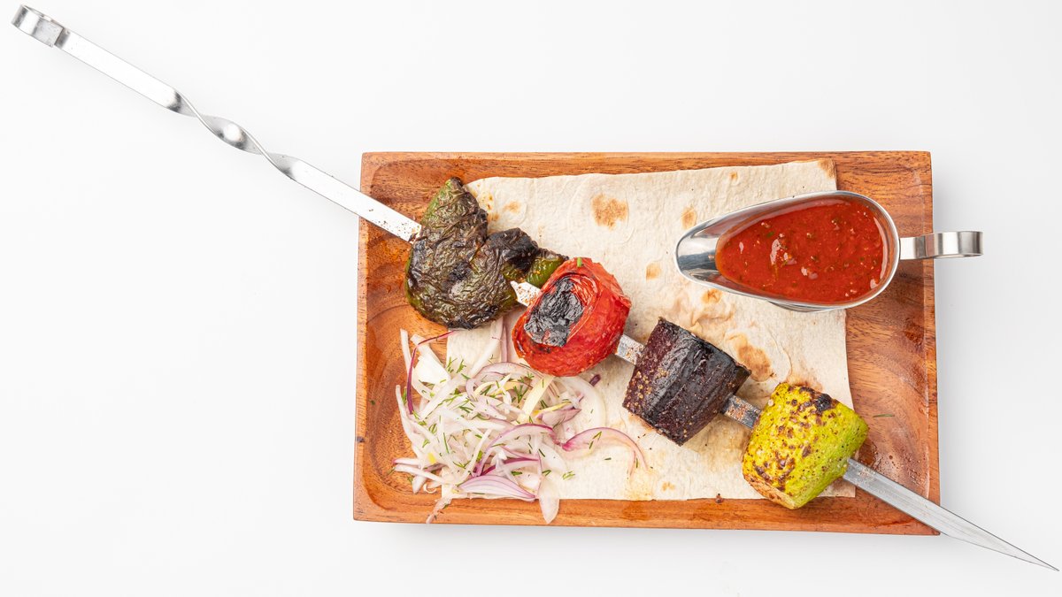 Ассорти из свежих овощей: перец, баклажан, лук и томаты, обжаренные на углях. Подаётся с ароматным маслом и травами