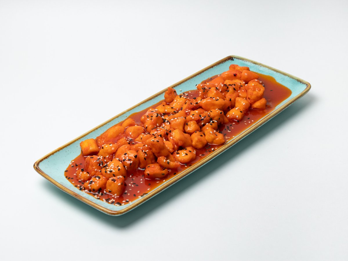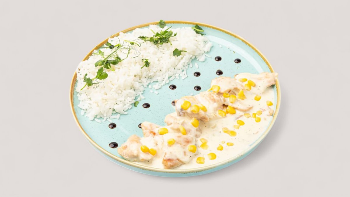 Филе курицы, медленно приготовленное в шелковистом сливочном соусе с лёгким акцентом белого перца и чеснока. Подаётся с воздушным жасминовым рисом — элегантное и сбалансированное блюдо