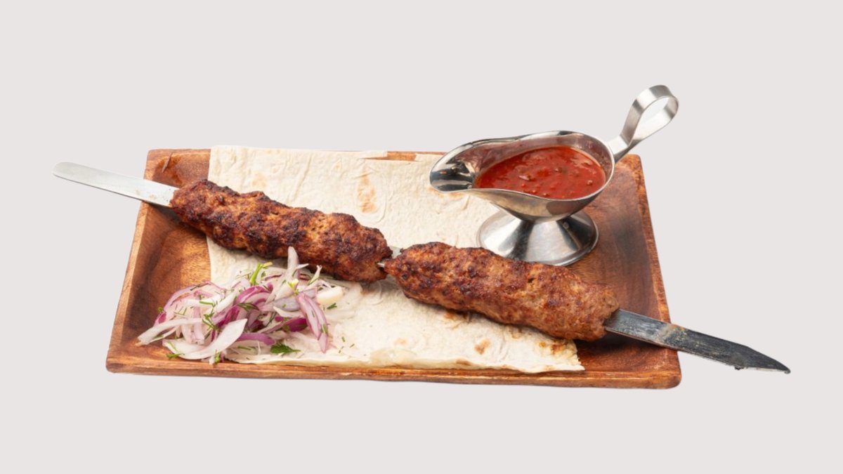 Рубленое мясо баранины с луком и специями, приготовленное на шампуре. Сочное, ароматное, с характерным восточным акцентом. Подаётся с зеленью и лавашом